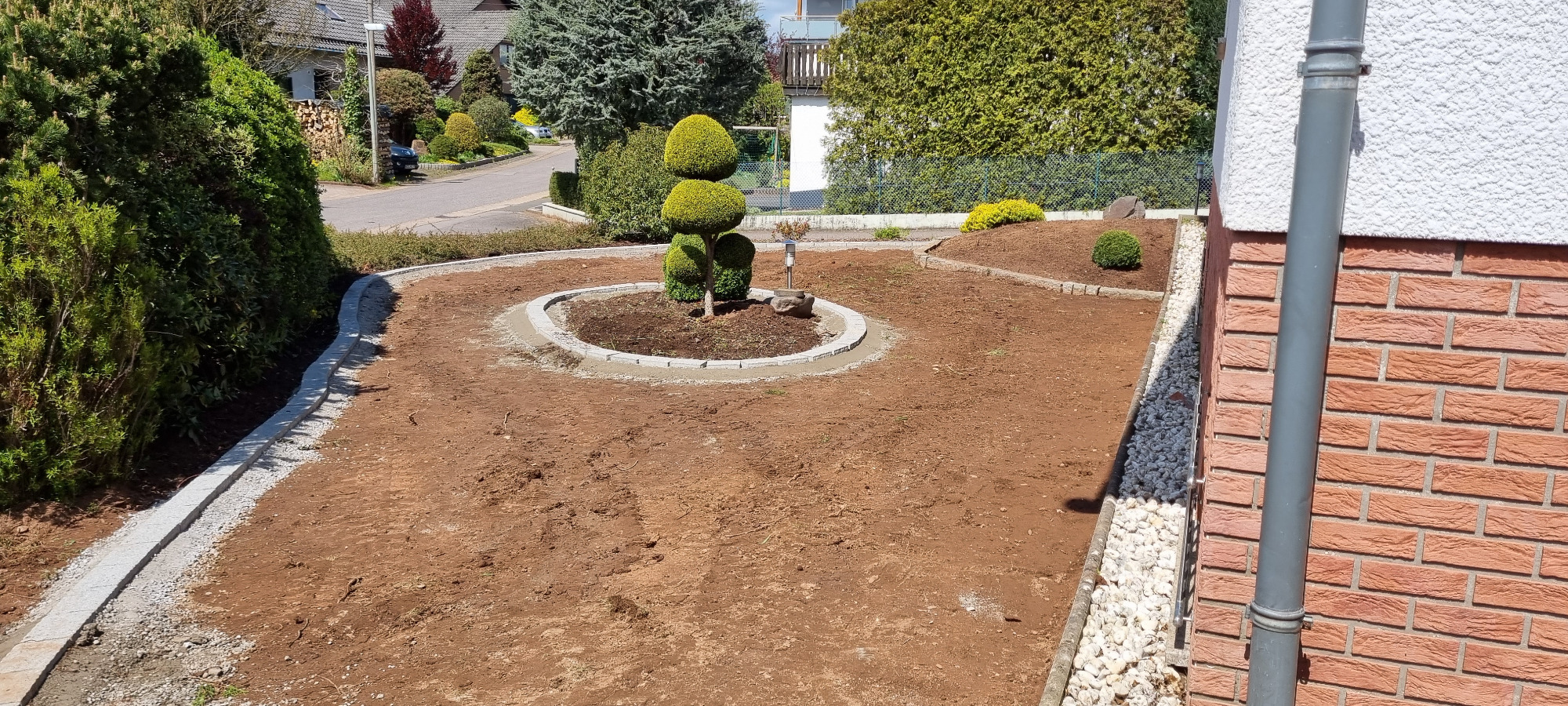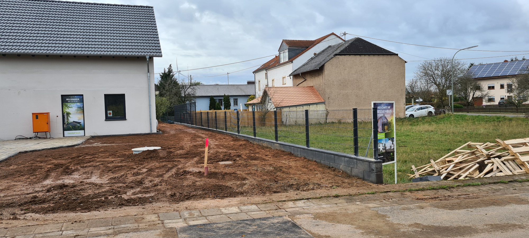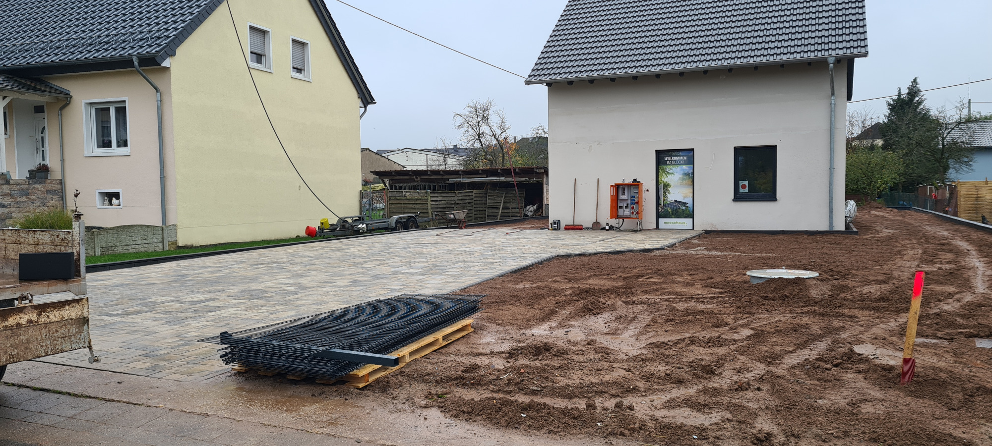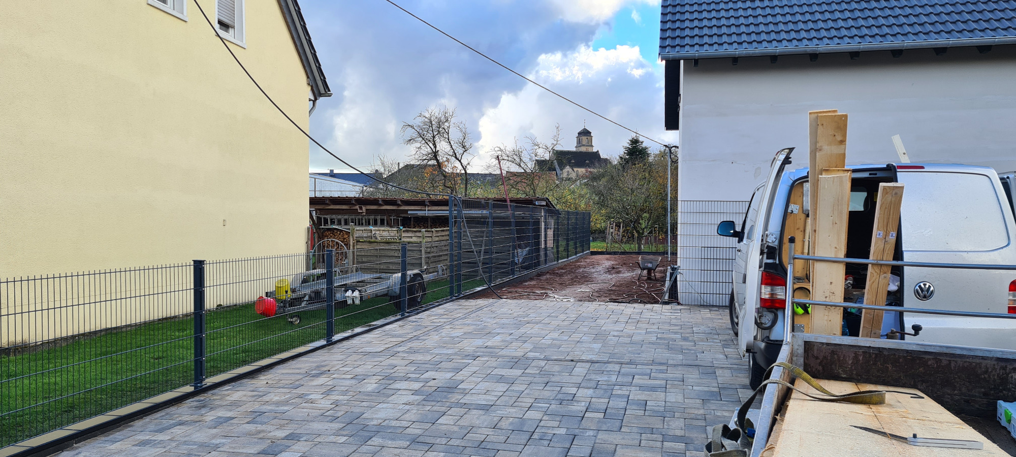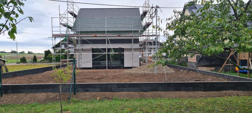 Neubau. Schalmauer mit Doppelstabmatten Zaun. Eingangsbereich mit Verbundsteinen. Anlegen einer Rasenfläche