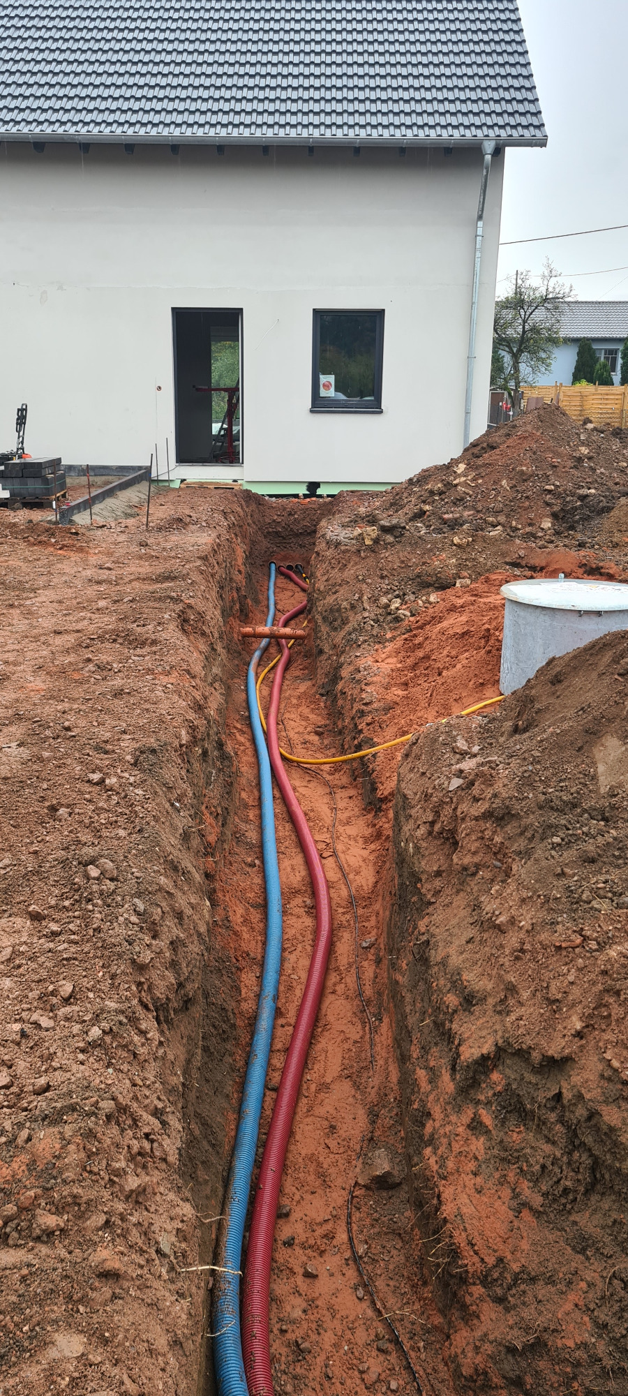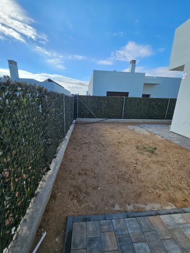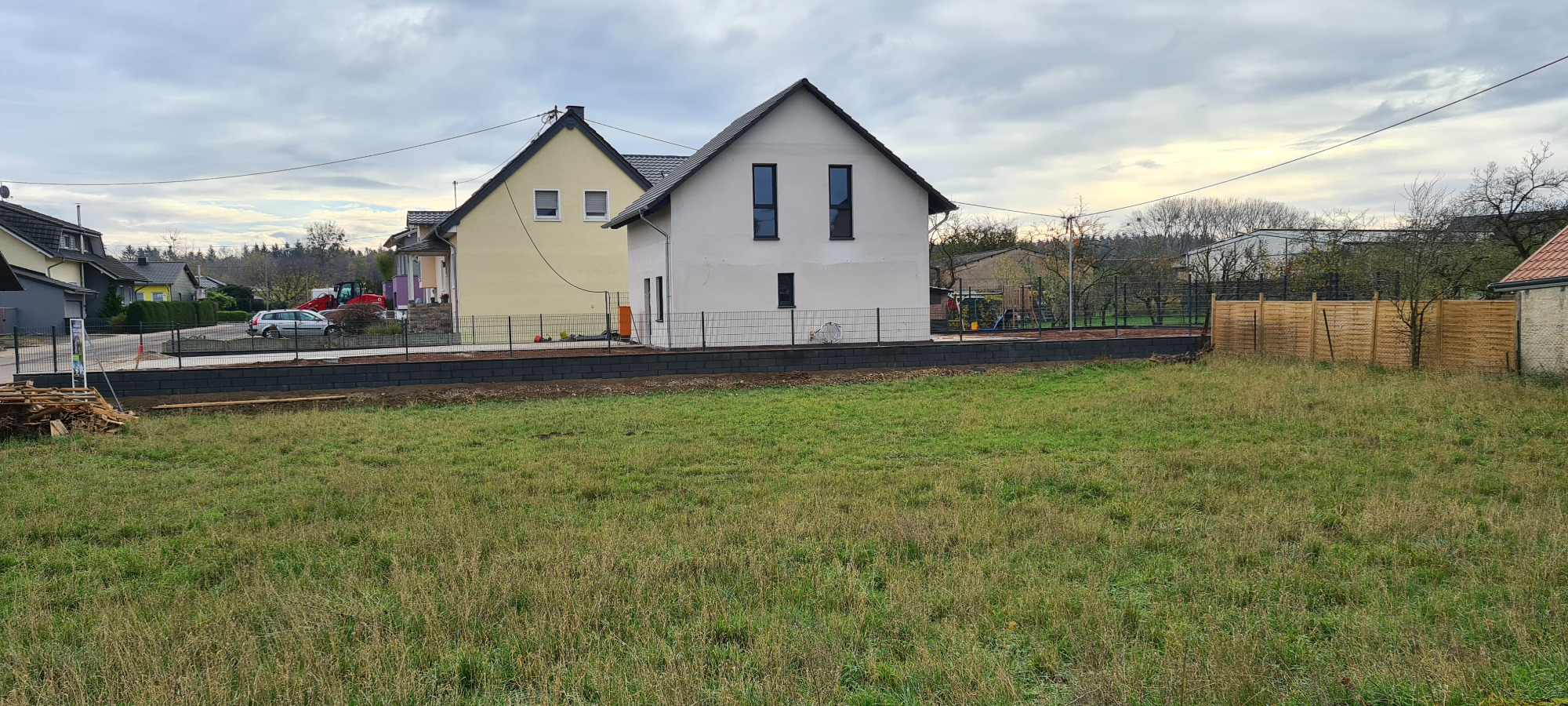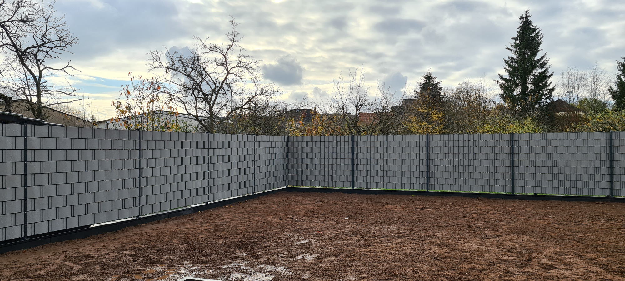 Neubau. Schalmauer mit Doppelstabmatten Zaun. Eingangsbereich mit Verbundsteinen. Anlegen einer Rasenfläche