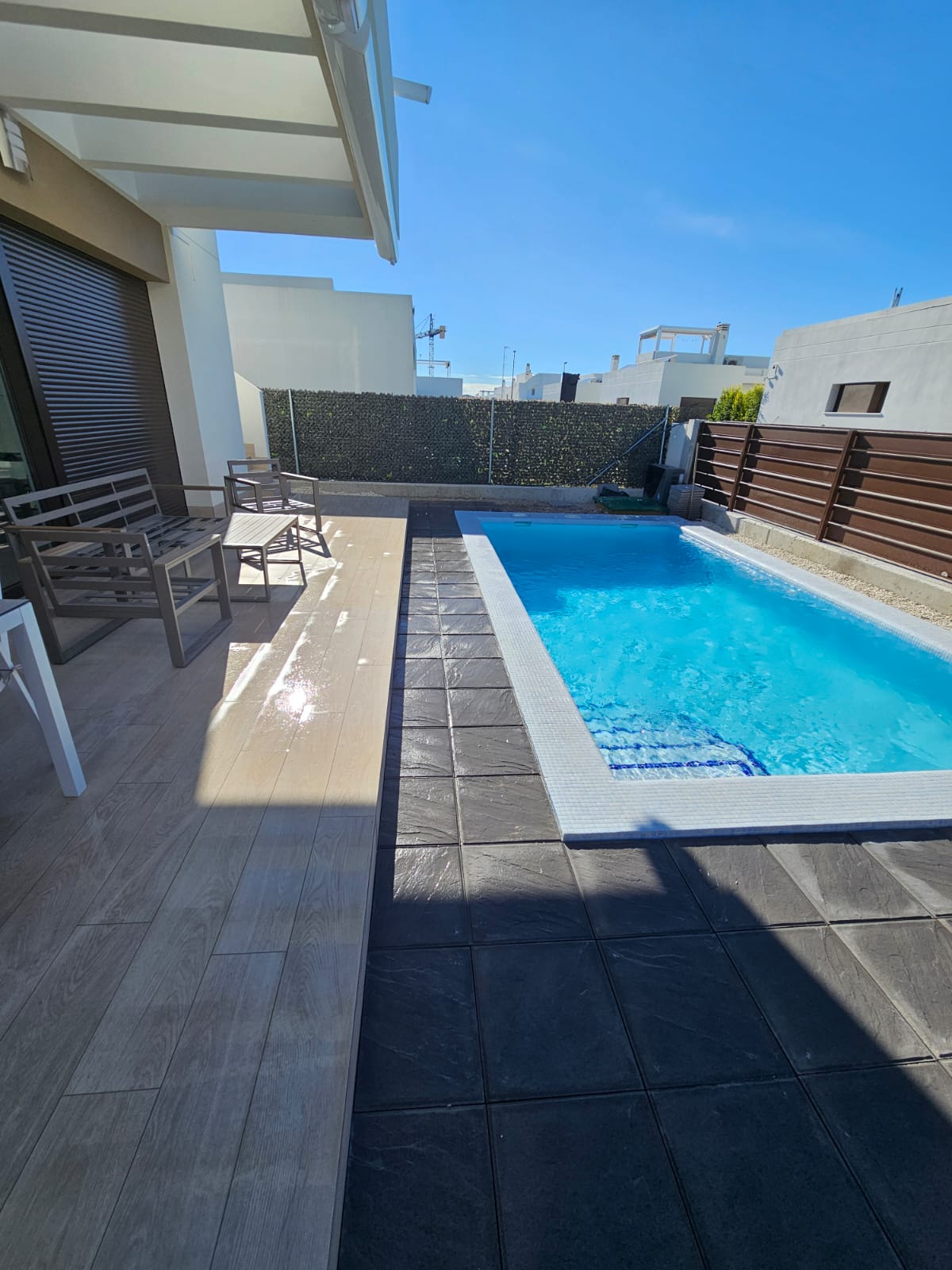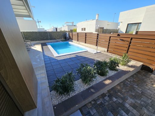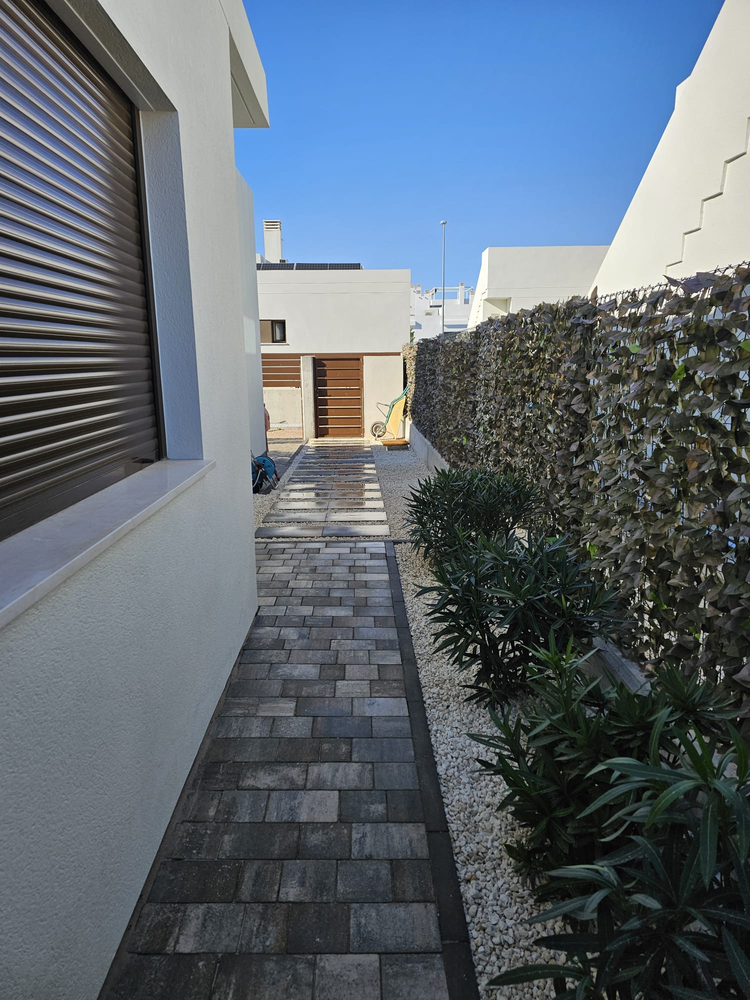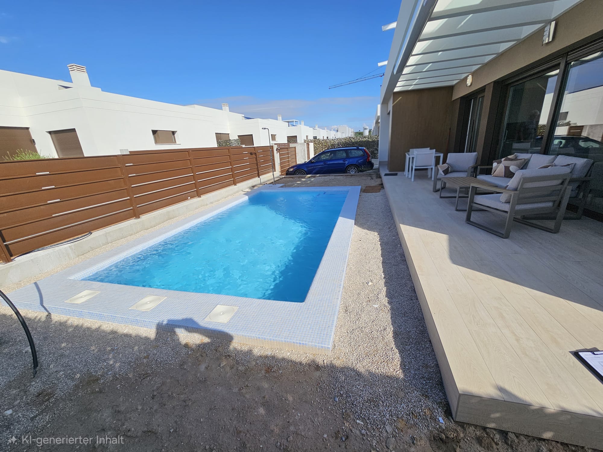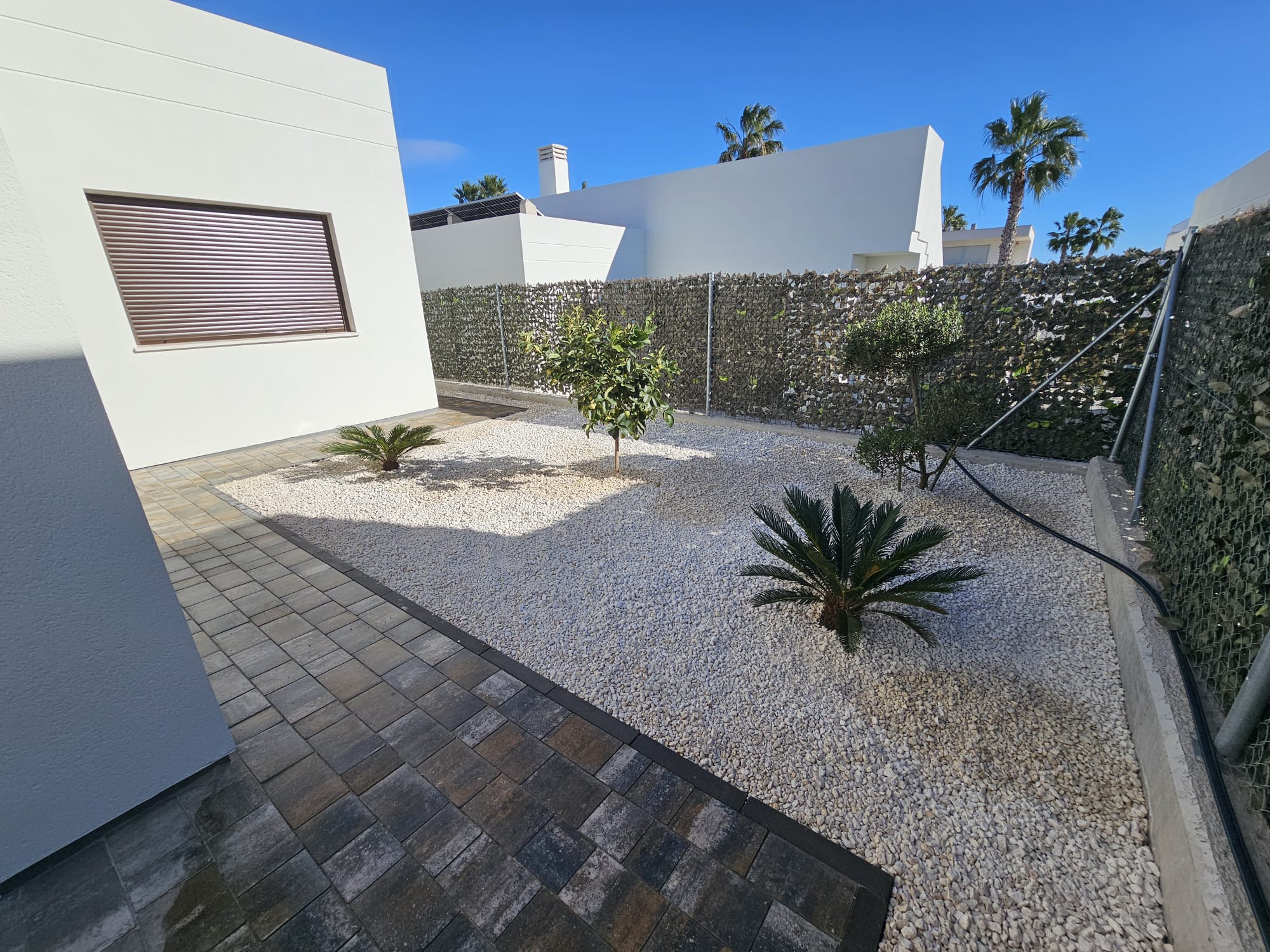 Neubau. Schalmauer mit Doppelstabmatten Zaun. Eingangsbereich mit Verbundsteinen. Anlegen einer Rasenfläche