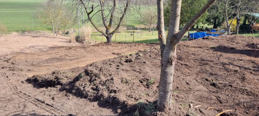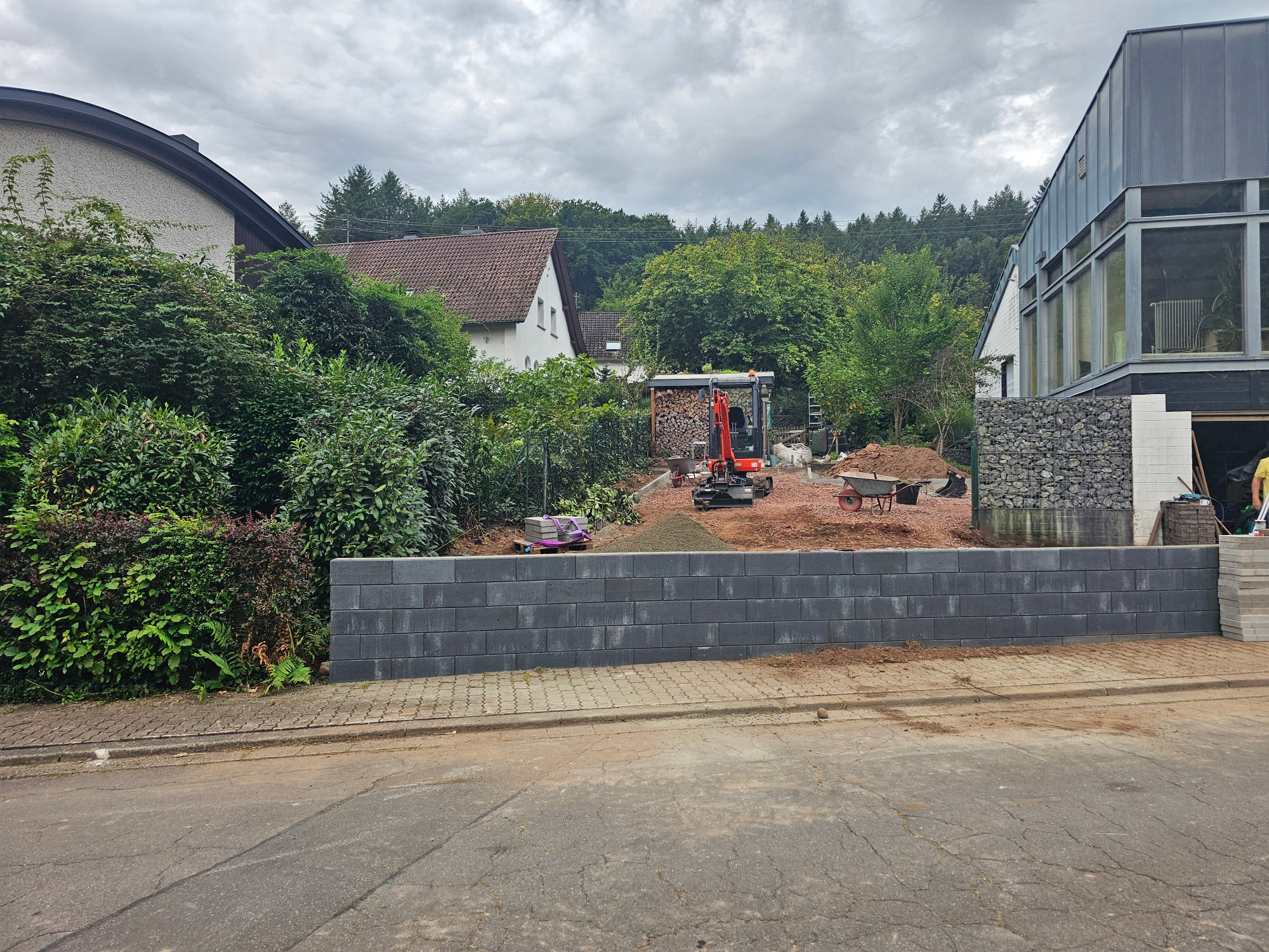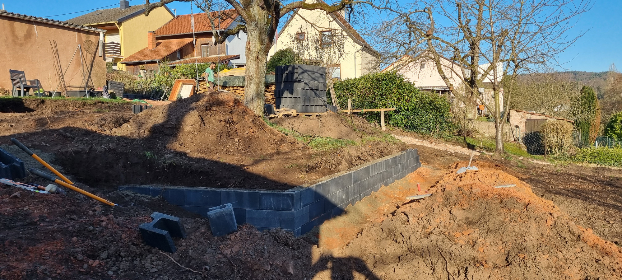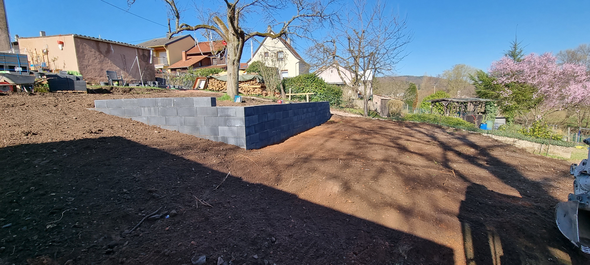 Bäume und Wurzelwerk entfernt, abschüssiges Gelände mit Mauer abgefangen und Stellplätze erstellen