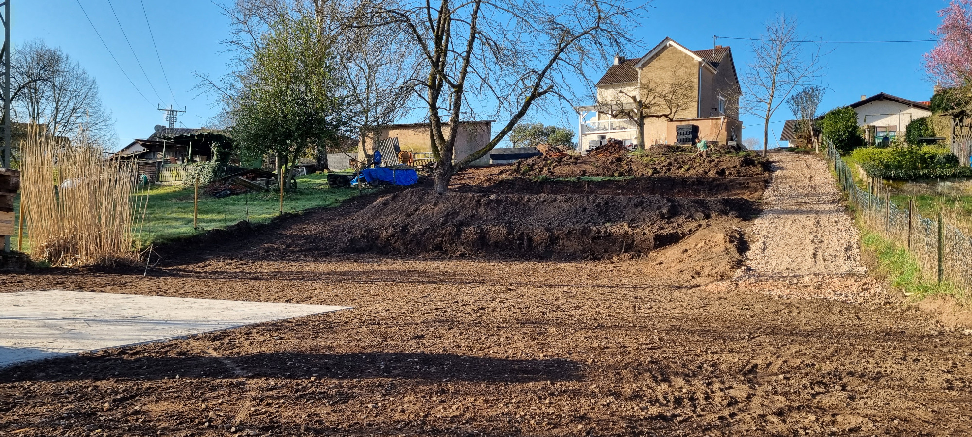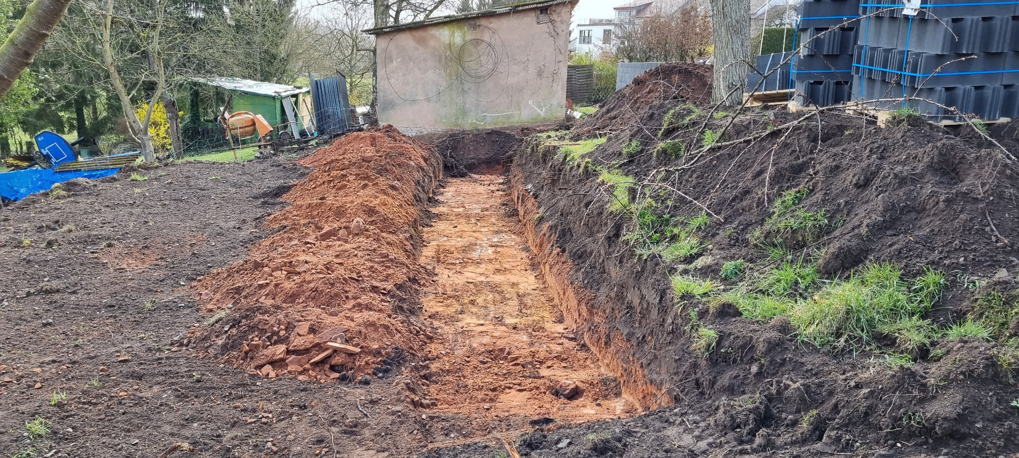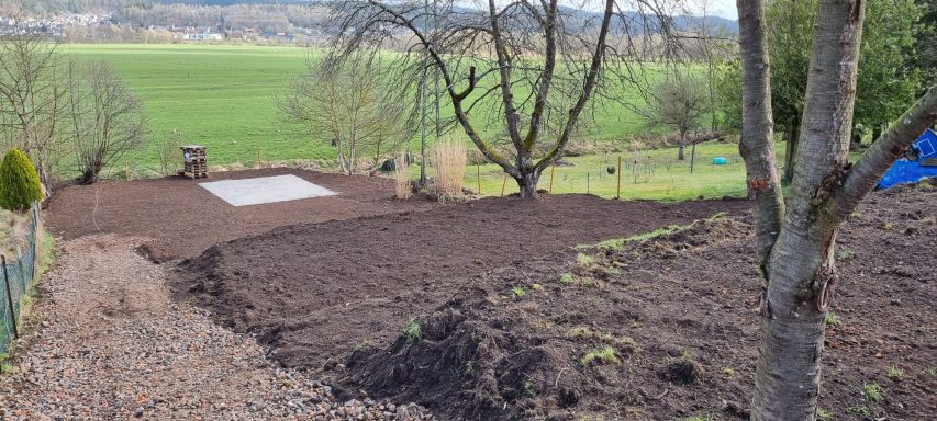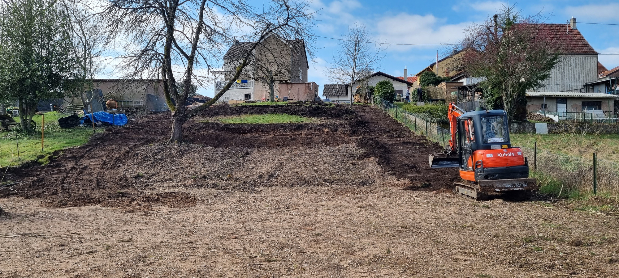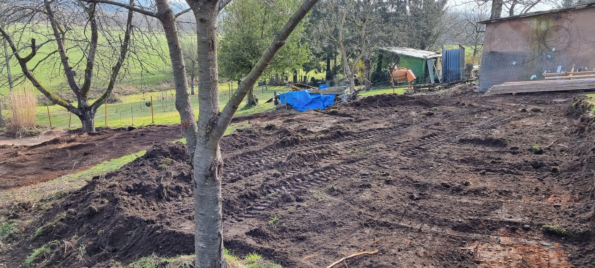Bäume und Wurzelwerk entfernt, abschüssiges Gelände mit Mauer abgefangen und Stellplätze erstellen