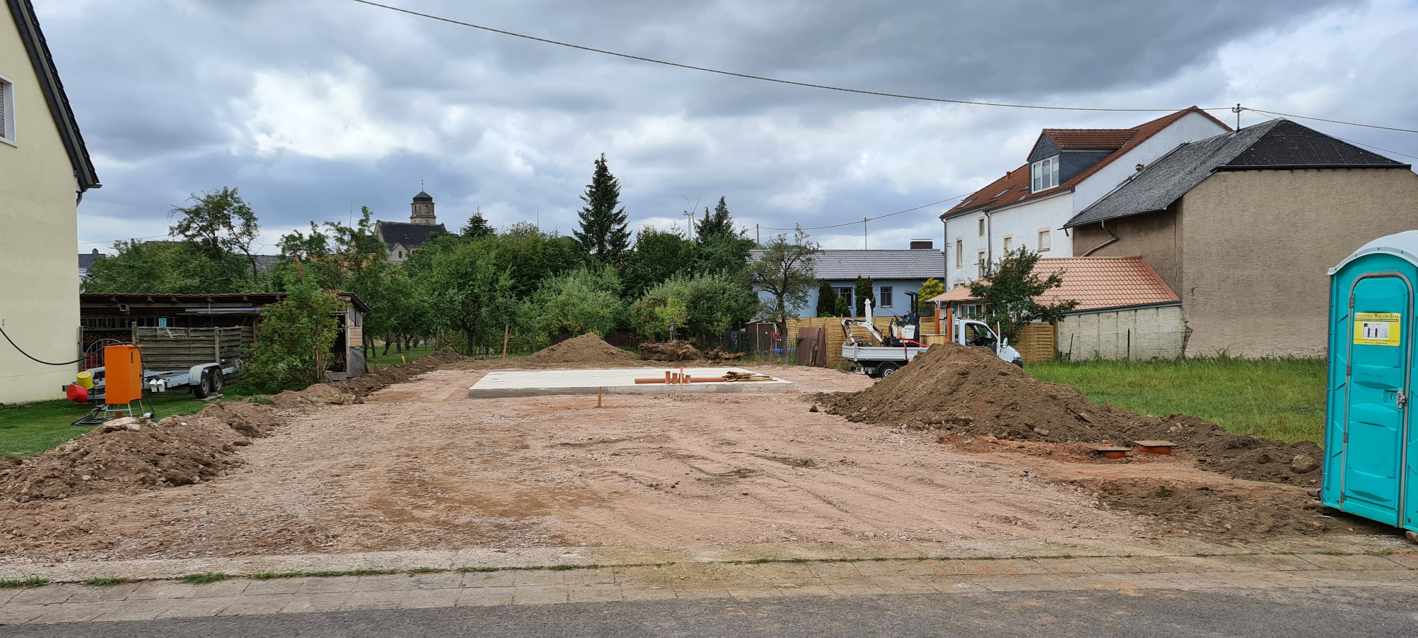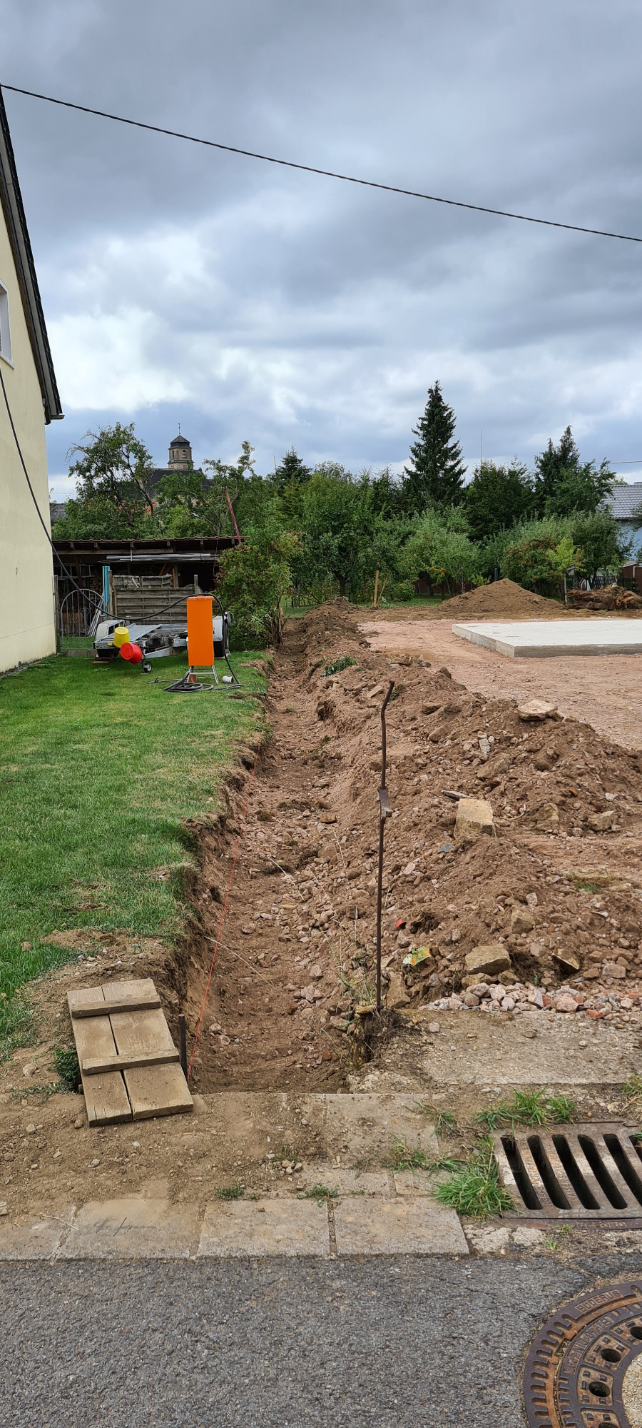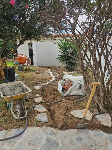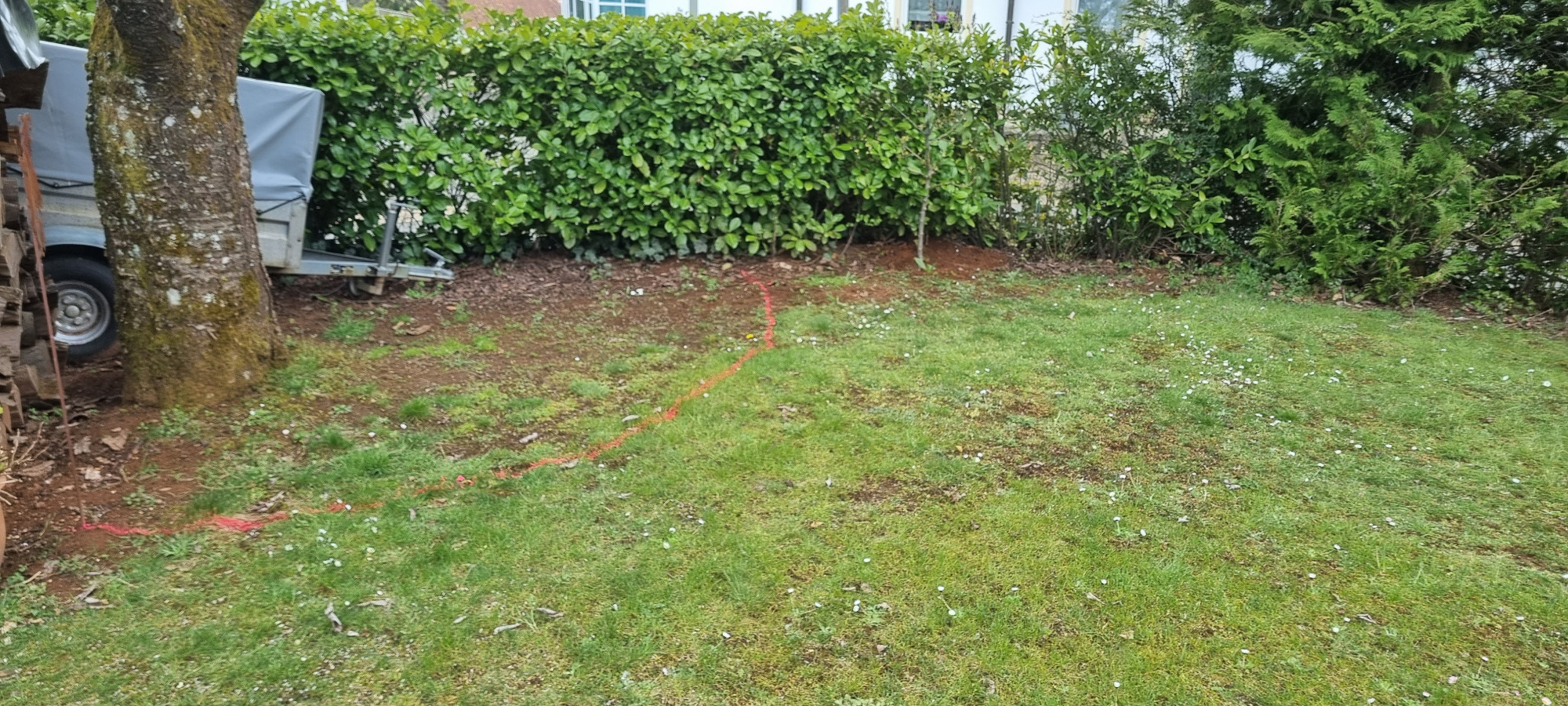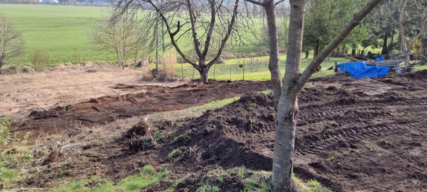 Bäume und Wurzelwerk entfernt, abschüssiges Gelände mit Mauer abgefangen und Stellplätze erstellen