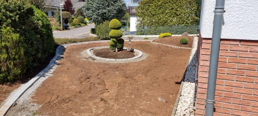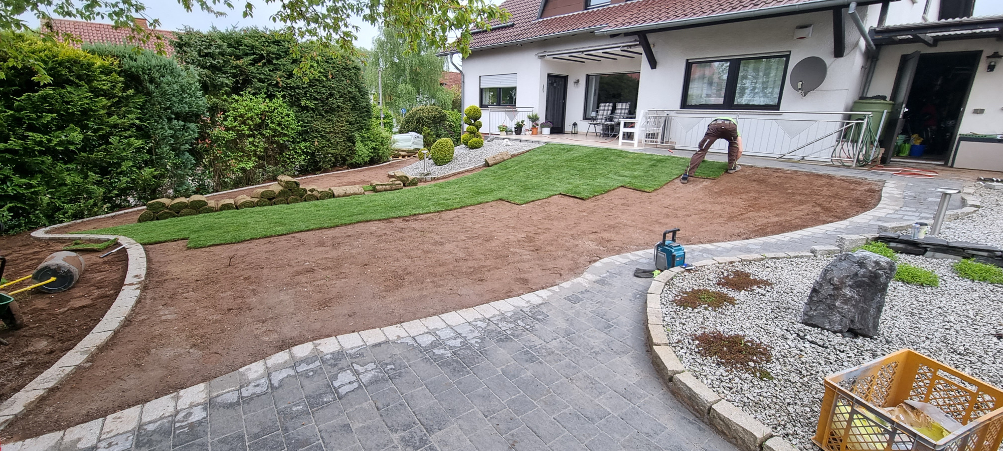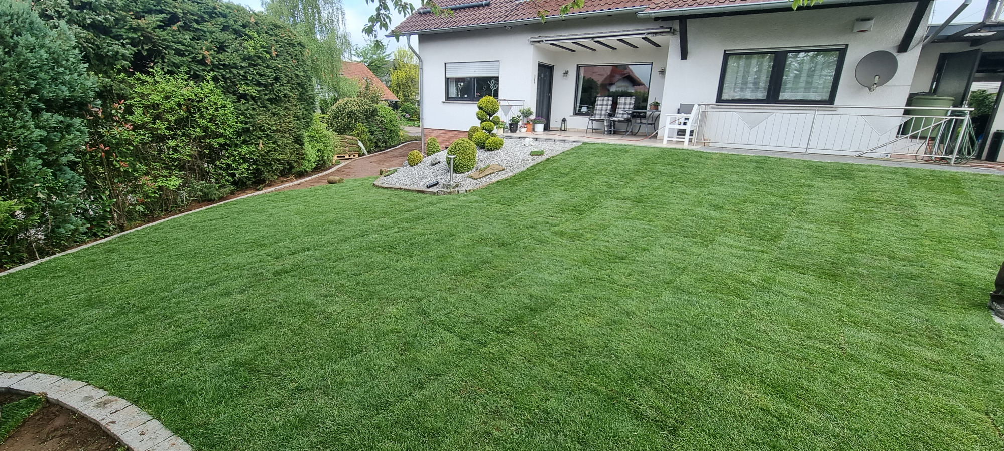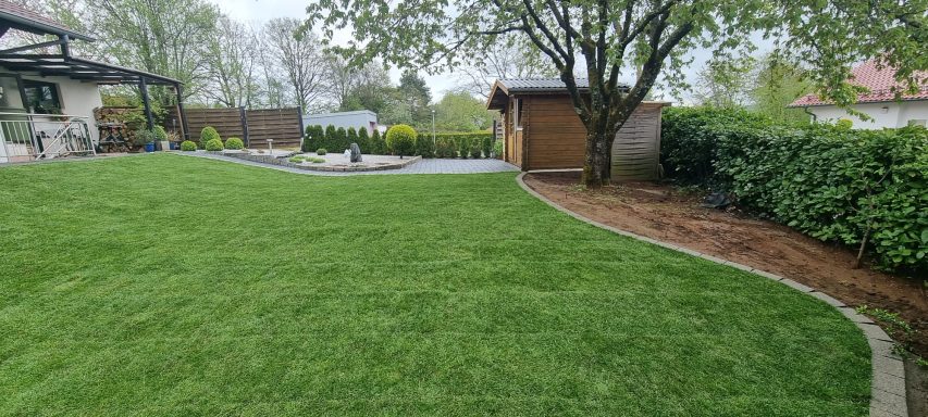 Wiese entfernen, Rasenkanten in Wellenform erstellen, Gehwege gestalten und Rollrasen verlegen