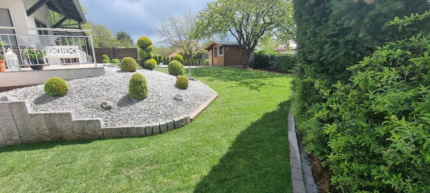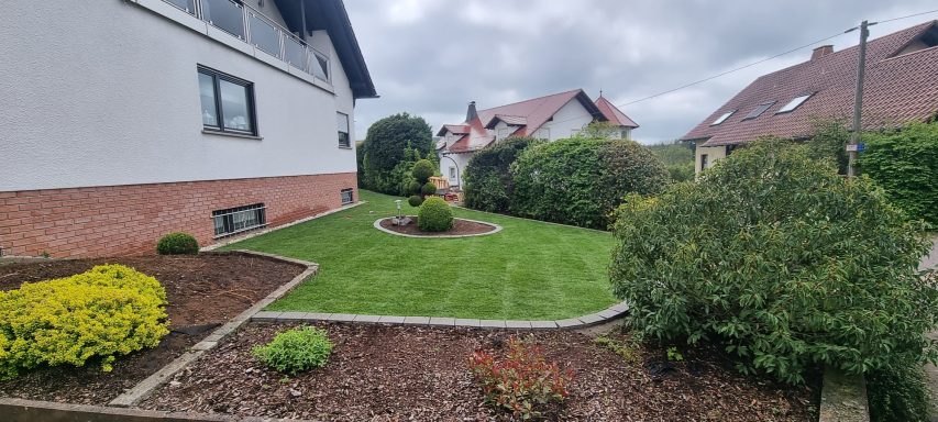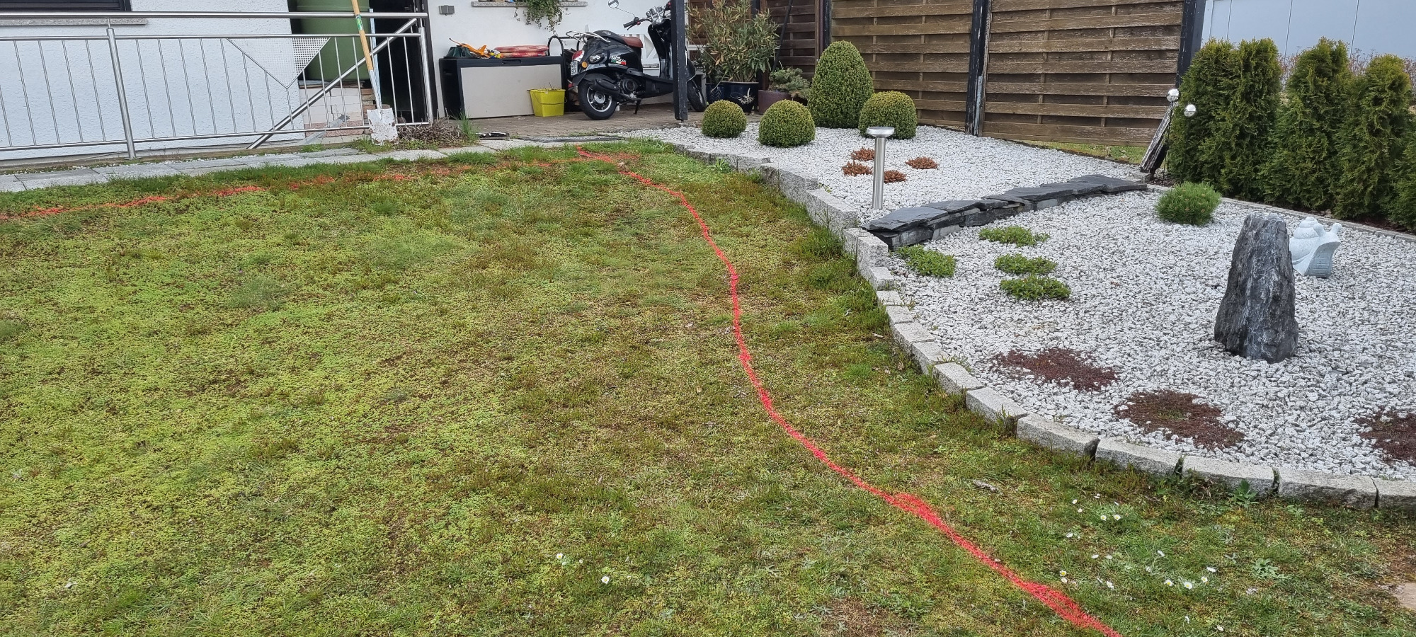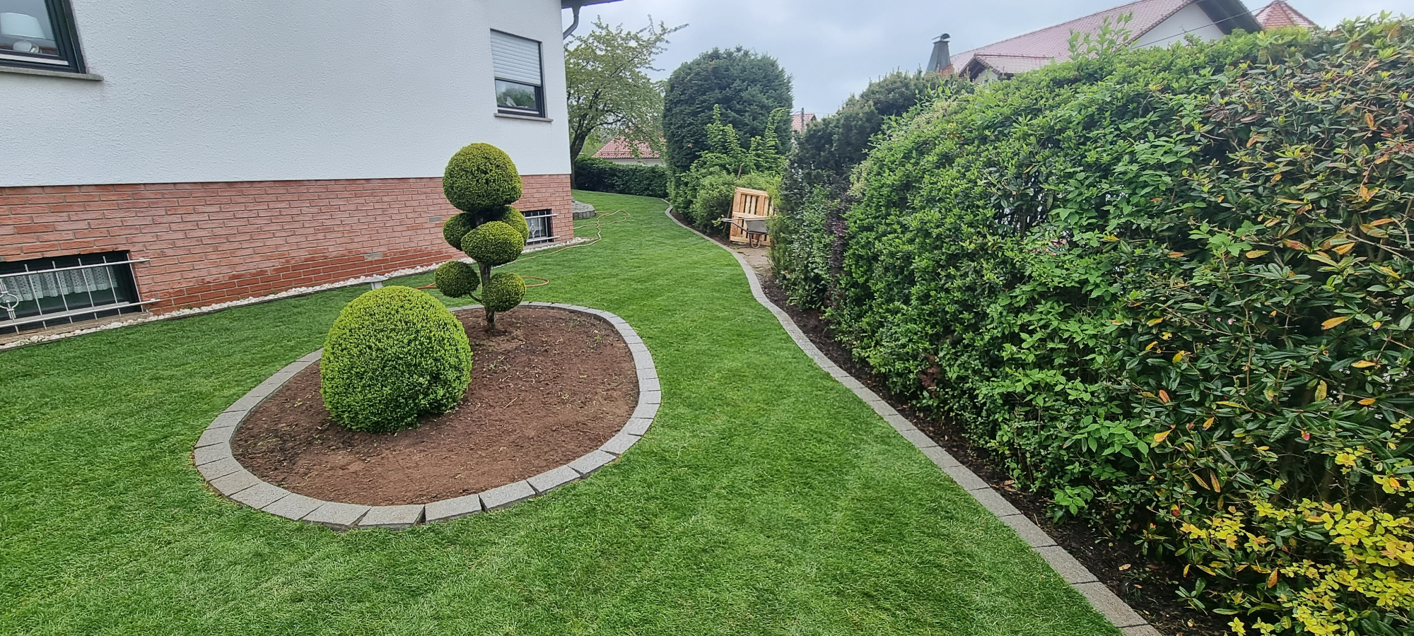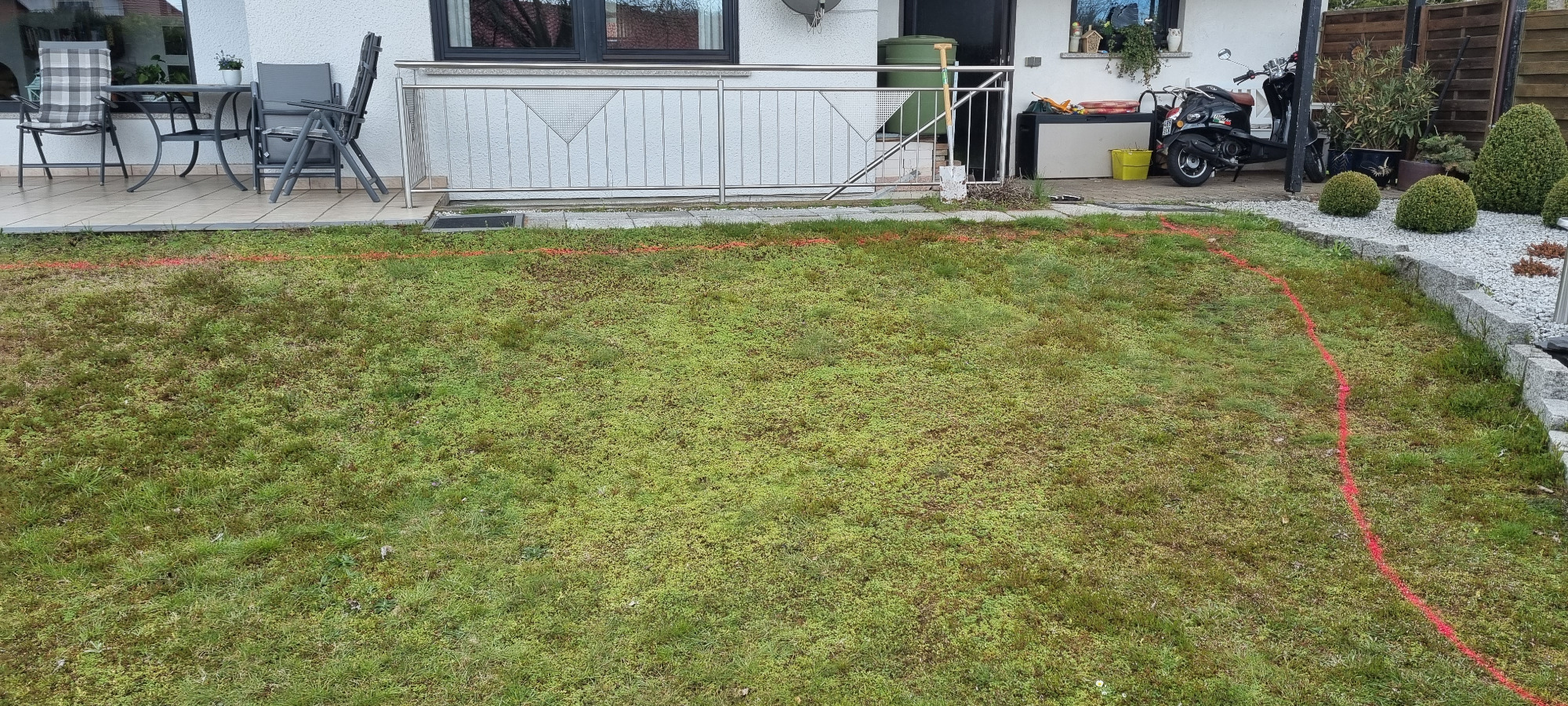 Wiese entfernen, Rasenkanten in Wellenform erstellen, Gehwege gestalten und Rollrasen verlegen