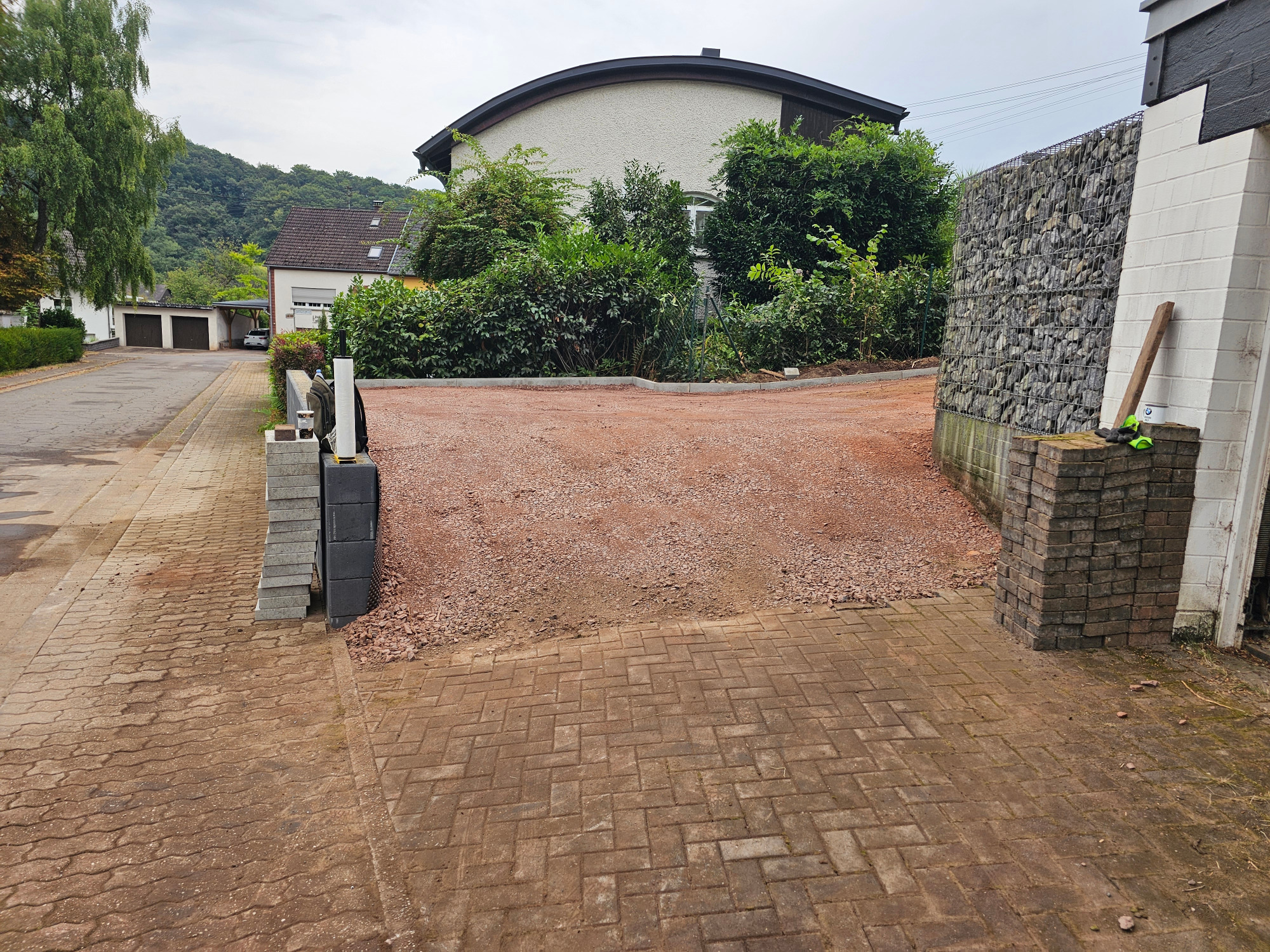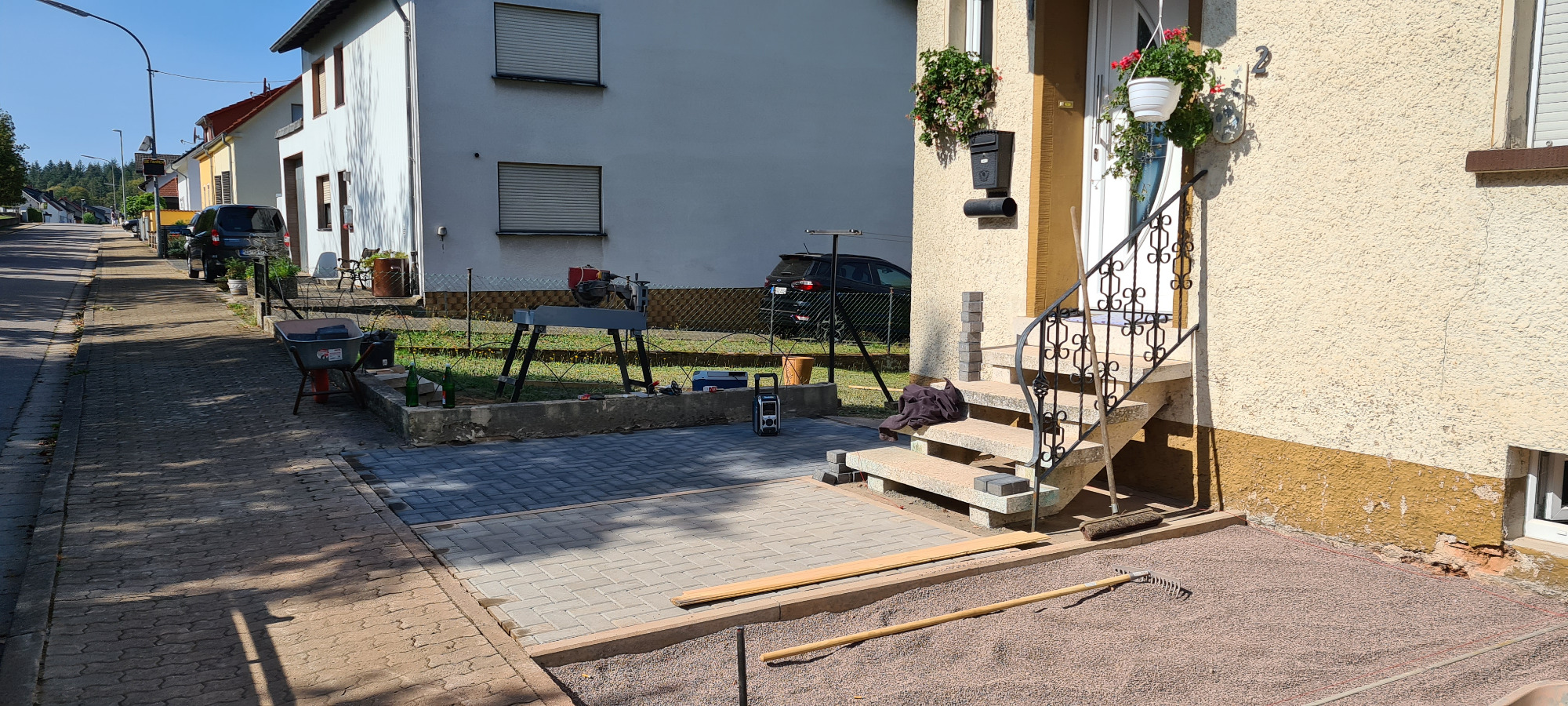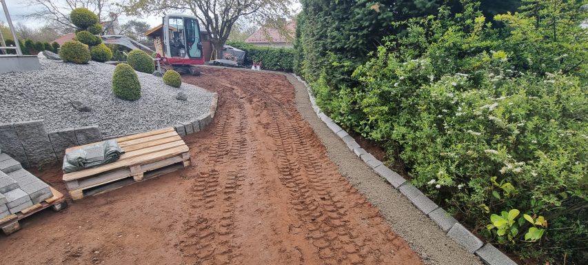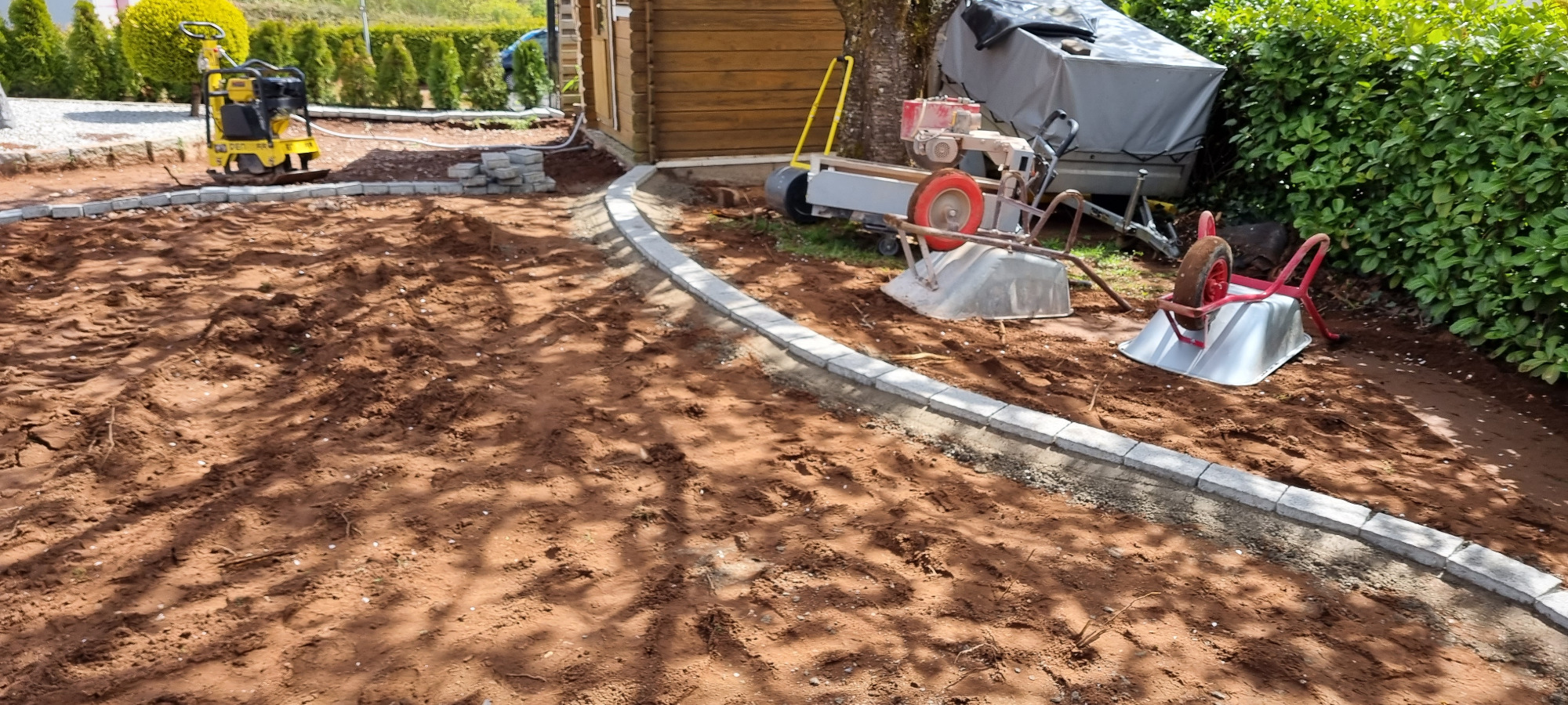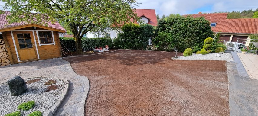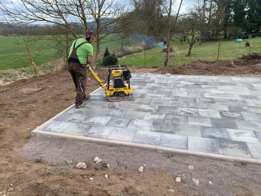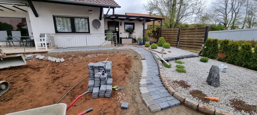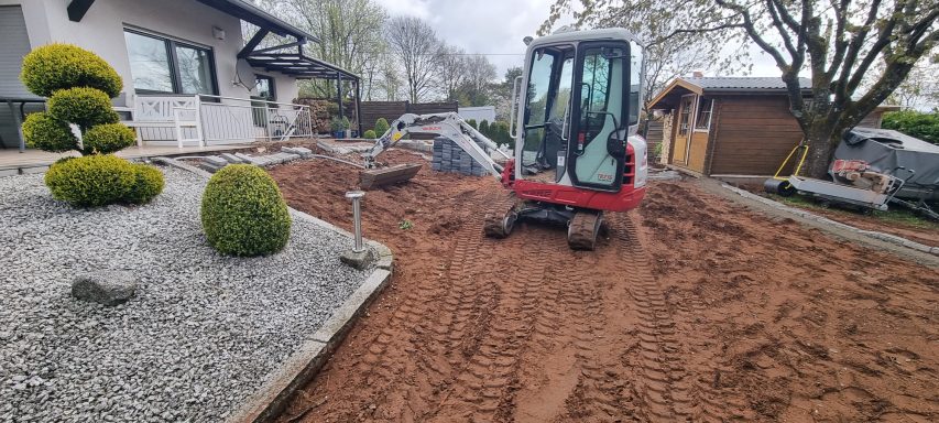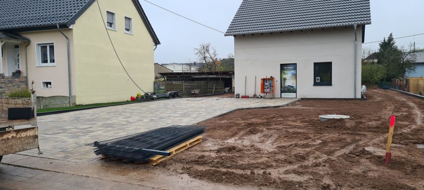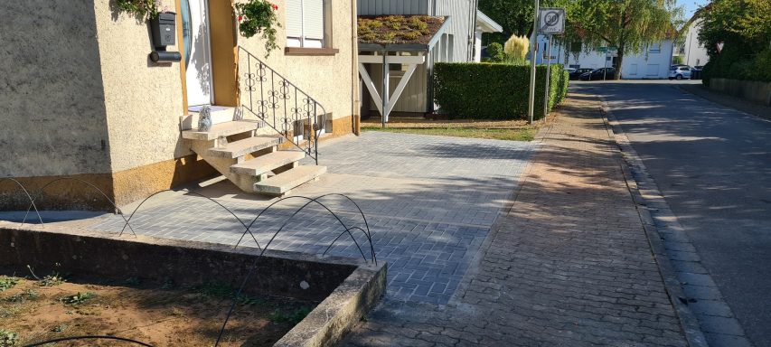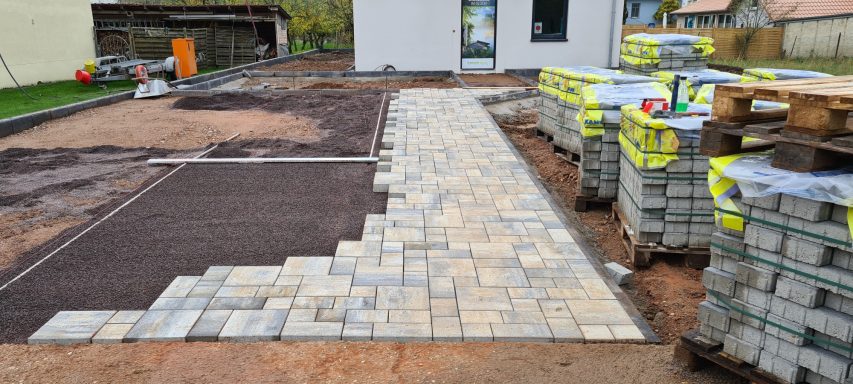 Betonfläche entfernen, Unterbau erstellen und Verbundsteine verlegen