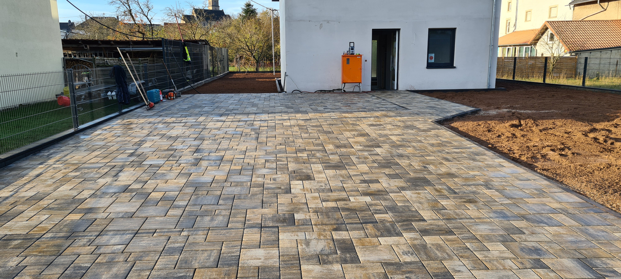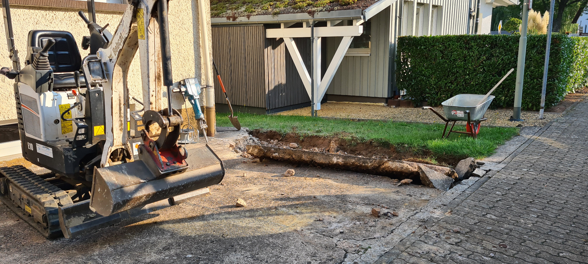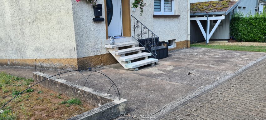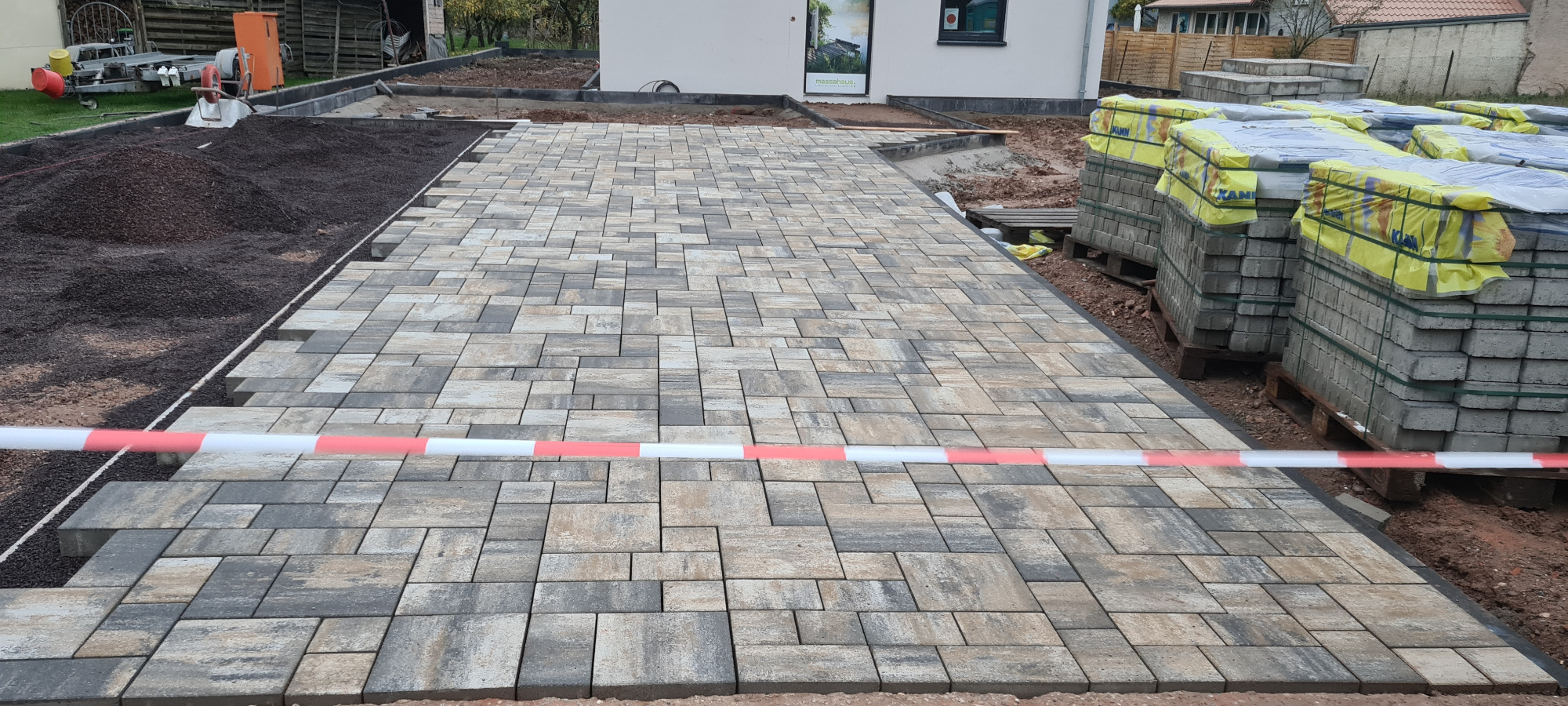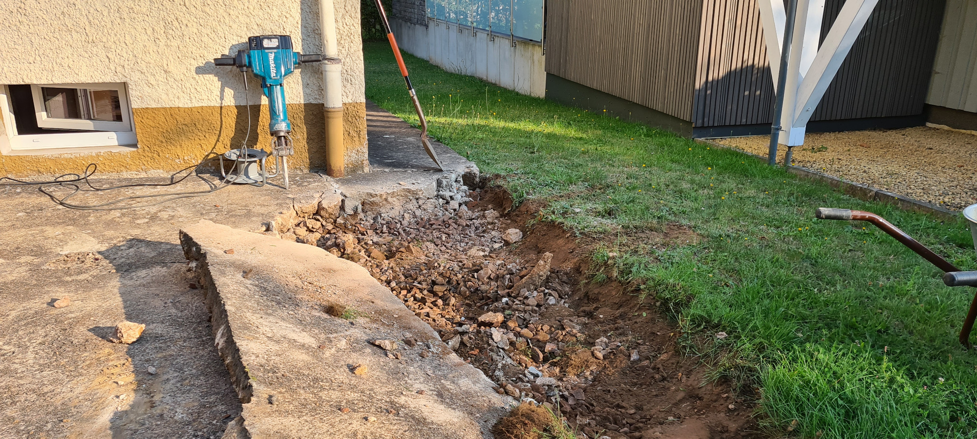 Betonfläche entfernen, Unterbau erstellen und Verbundsteine verlegen