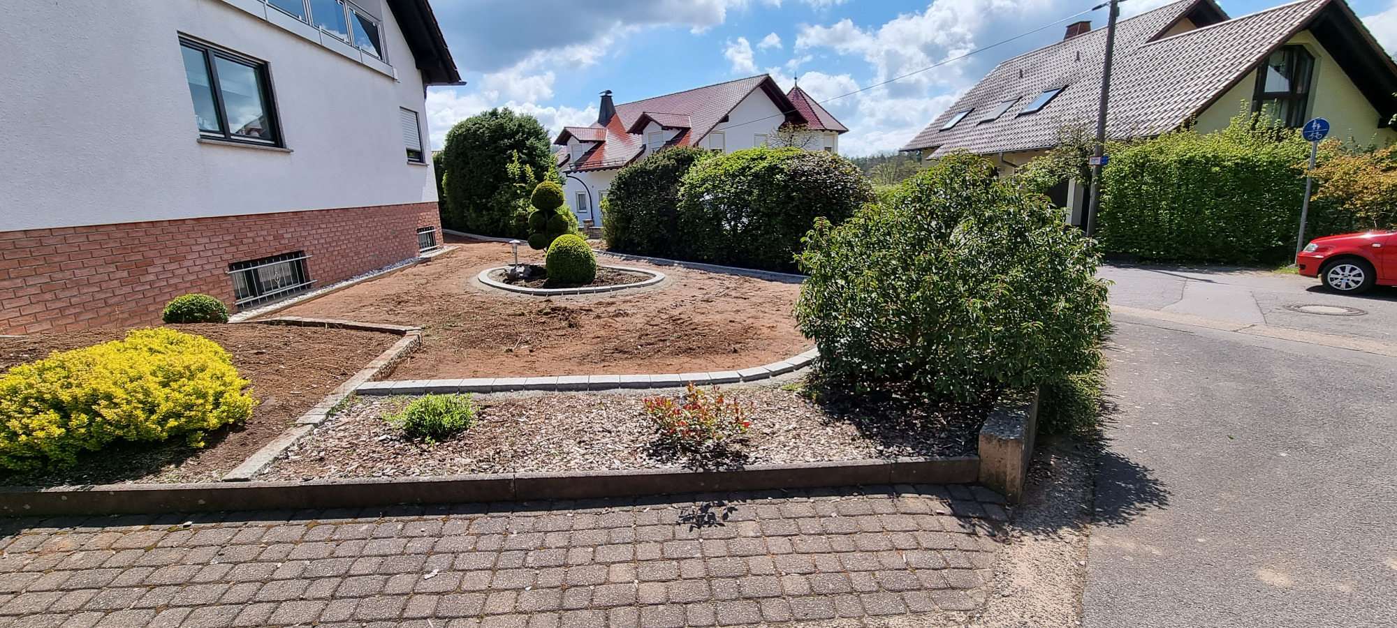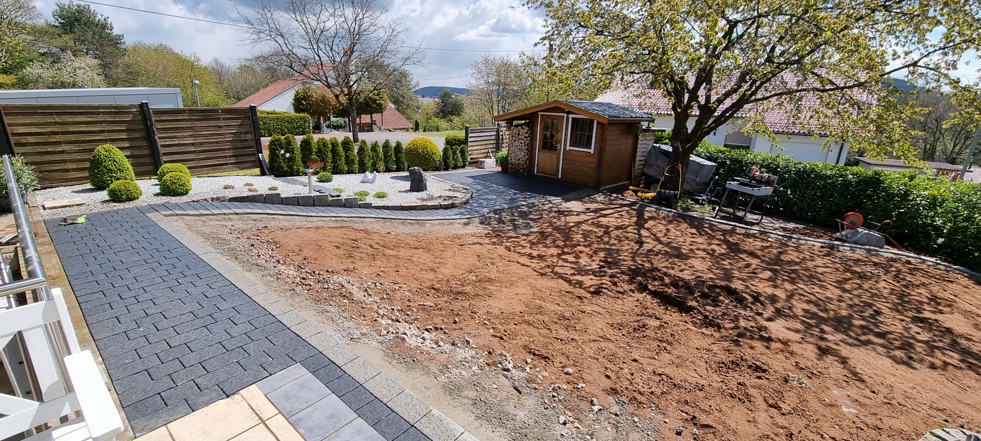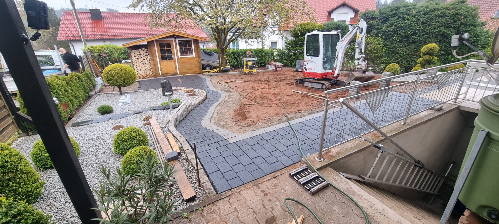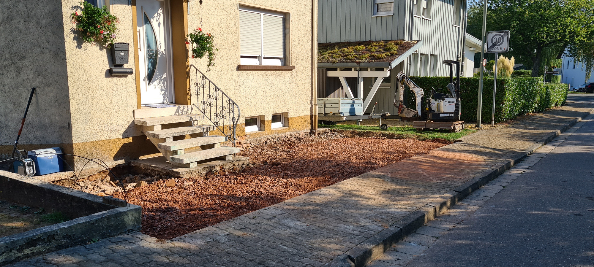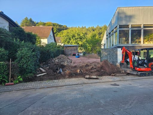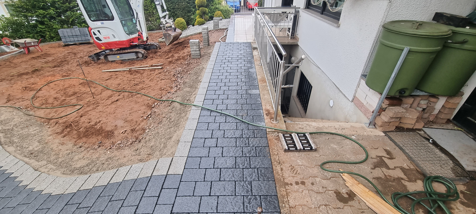 Betonfläche entfernen, Unterbau erstellen und Verbundsteine verlegen