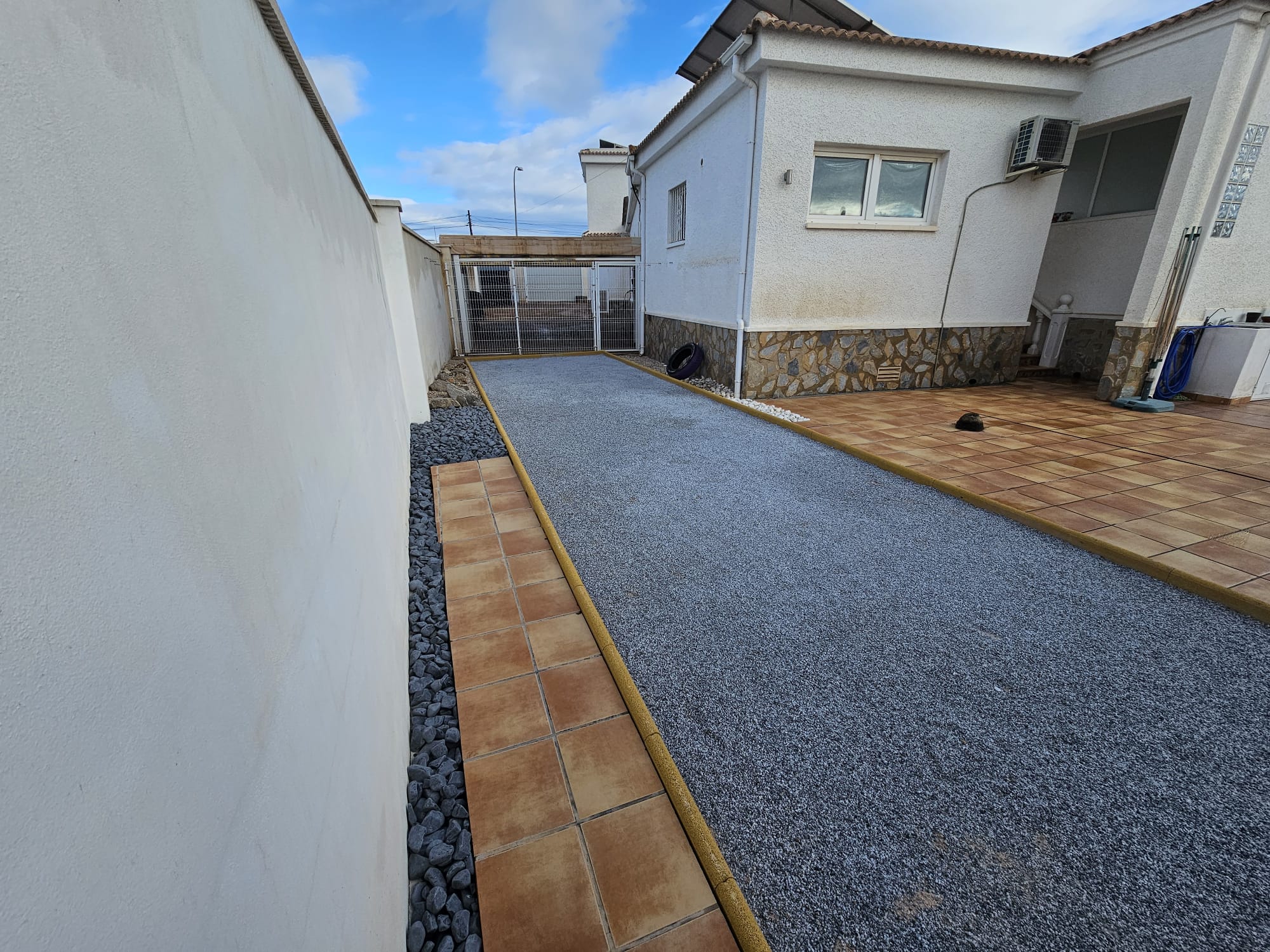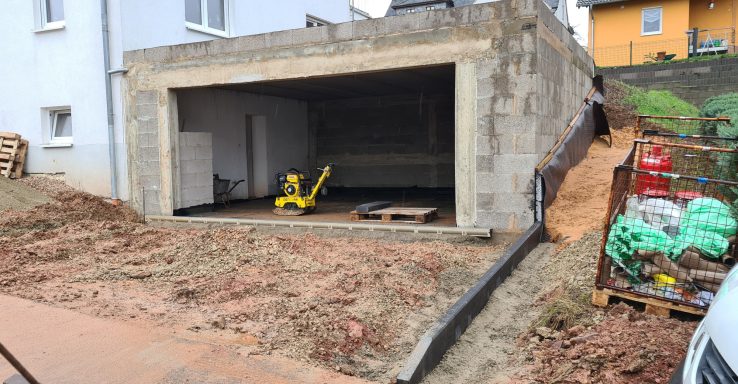 Hanglage Terrassenförmig abfangen. PKW Zufahrt mit Schotterrasen, Verbundstein-Terrasse erstellen und Schalmauer bauen