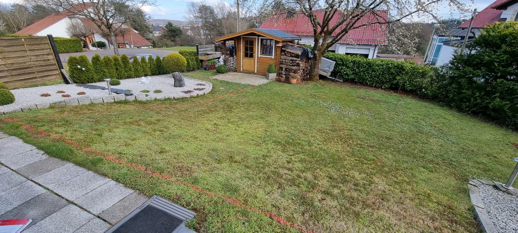 Gehweg zu Gartenhaus, Rasenkante erstellen, Wiese entfernen und Rollrasen verlegen